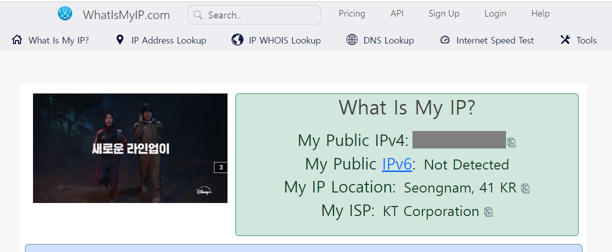 이 웹사이트에 접속하면 별다른 설정 없이도 바로 외부 IP를 확인할 수 있습니다.