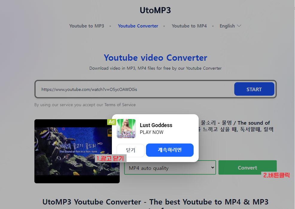 2. 새창이 열리면 광고는 무조건 닫기, 차단하시고, "convert"누르면 다운로드가 됩니다.